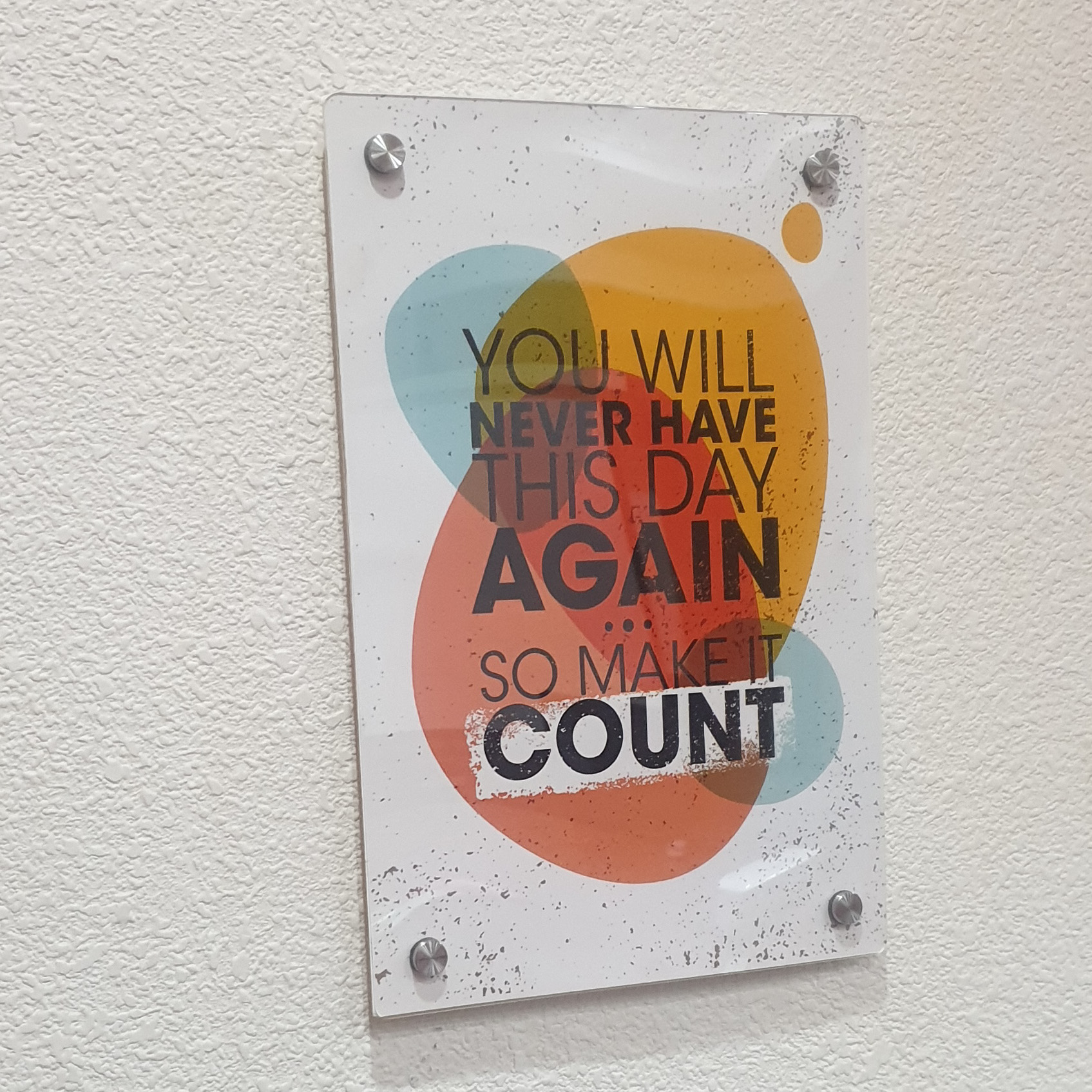 Modern acrylic wall signage with vibrant graphics and inspirational messaging for educational spaces.